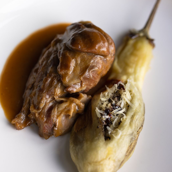 Geleneksel Tekniklerle Tencerede Pişirilmiş Kuzu İncik. Köz Patlıcan, Kars Gravyer Peyniri, Mürdüm Eriği ve Kırmızı Şarapla Kuzu Jus