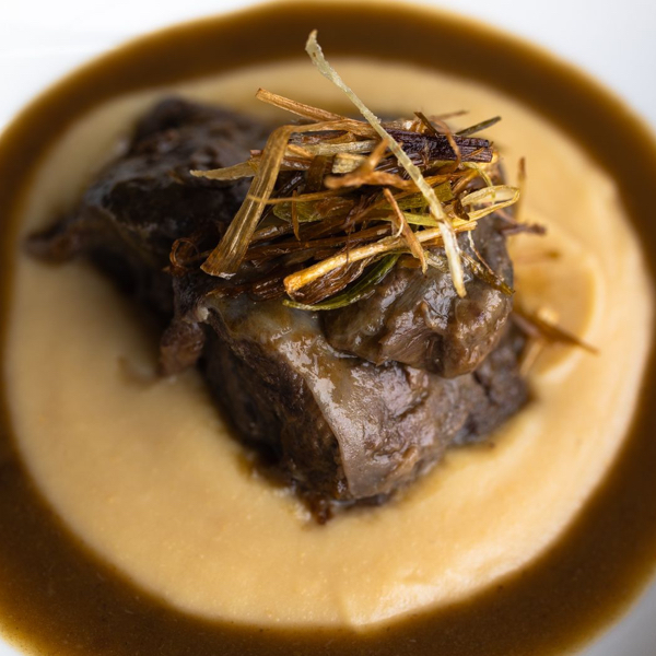 Geleneksel Tekniklerle Tencerede Pişirilmiş Dana Yanak. Ayva Beğendi, Pırasa Çıtırı, Kök Sebzeler ve Kırmızı Şarapla Dana Jus